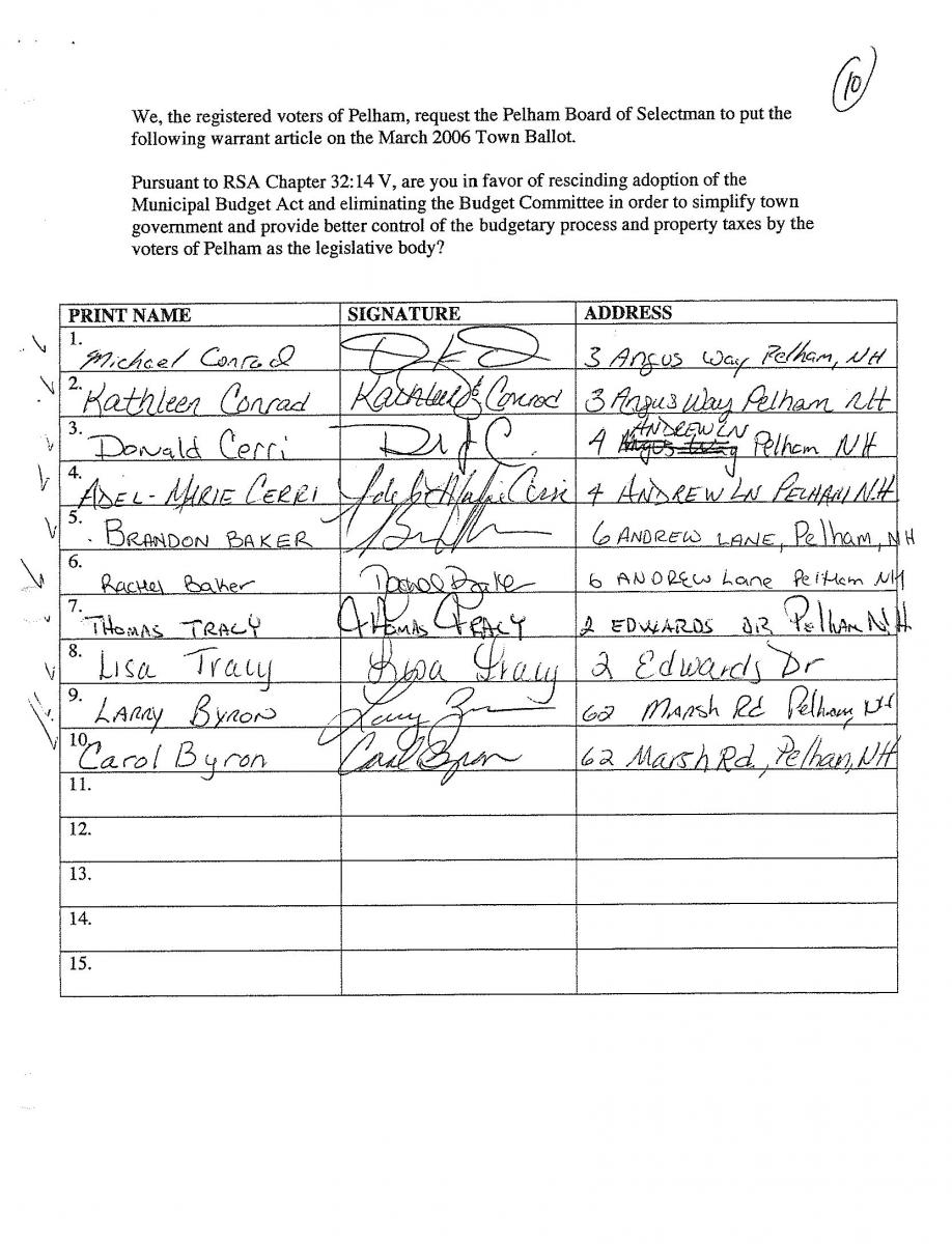 Pursuant to RSA Chapter 32:14 V, are you in favor of rescinding the adoption of the Municipal Budget Act and eliminating the Budget Committee? (Submitted by Petition)