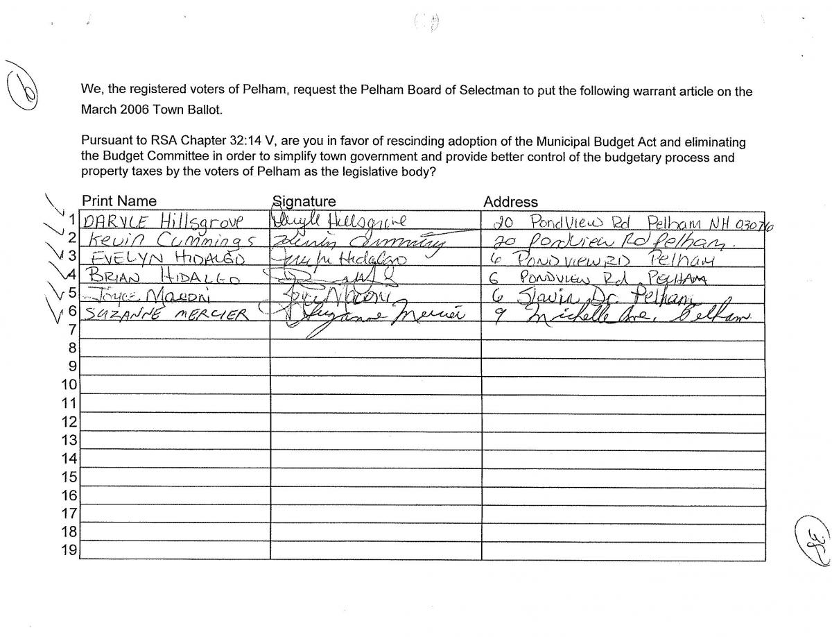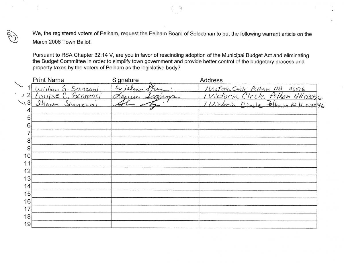 - Town Meeting: The legislative body present at the Deliberative Session approved an amendment to remove the following sentence from the end of the petition warrant: “in order to simplify town government and provide better control of the budgetary process and property taxes by the voters of Pelham as the legislative body?”