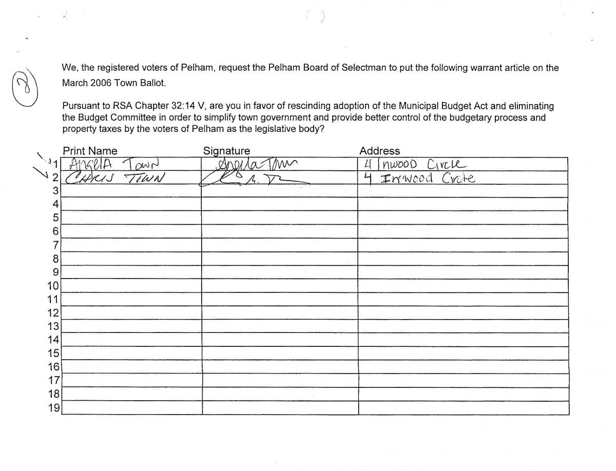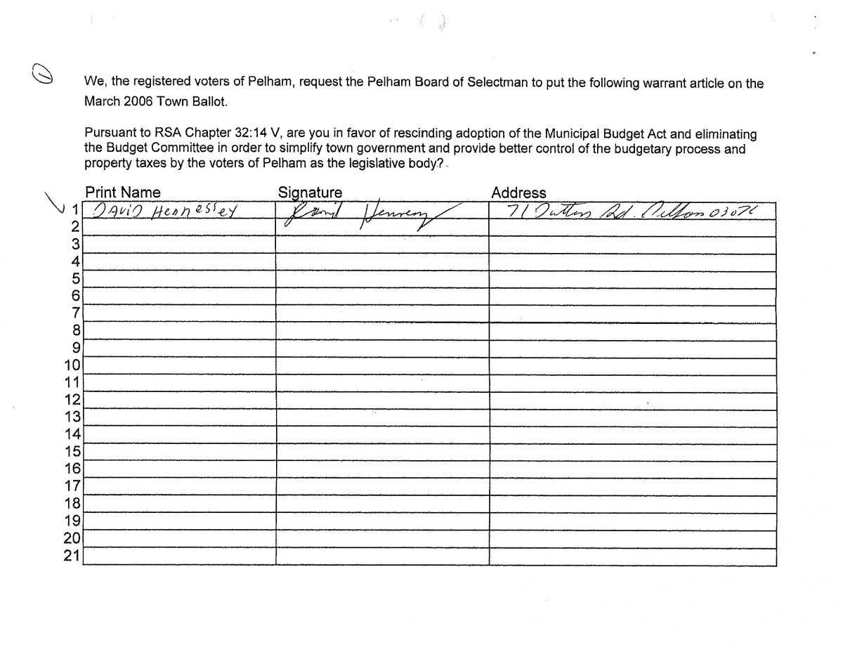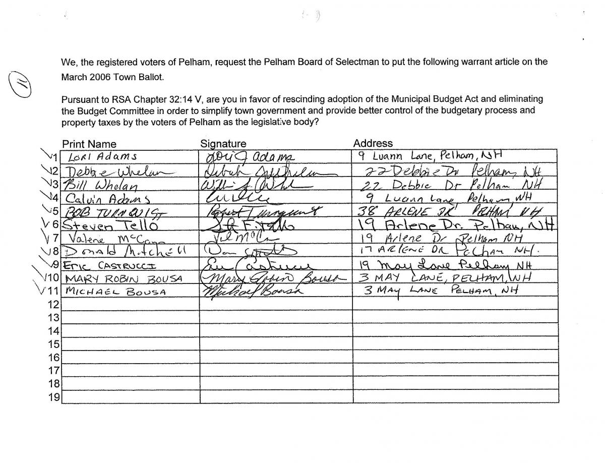 - Town Meeting: The legislative body present at the Deliberative Session approved an amendment to remove the following sentence from the end of the petition warrant: “in order to simplify town government and provide better control of the budgetary process and property taxes by the voters of Pelham as the legislative body?”
