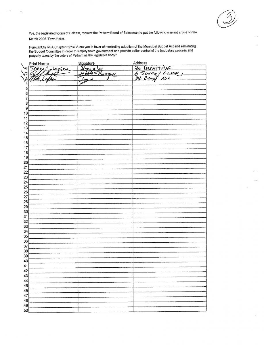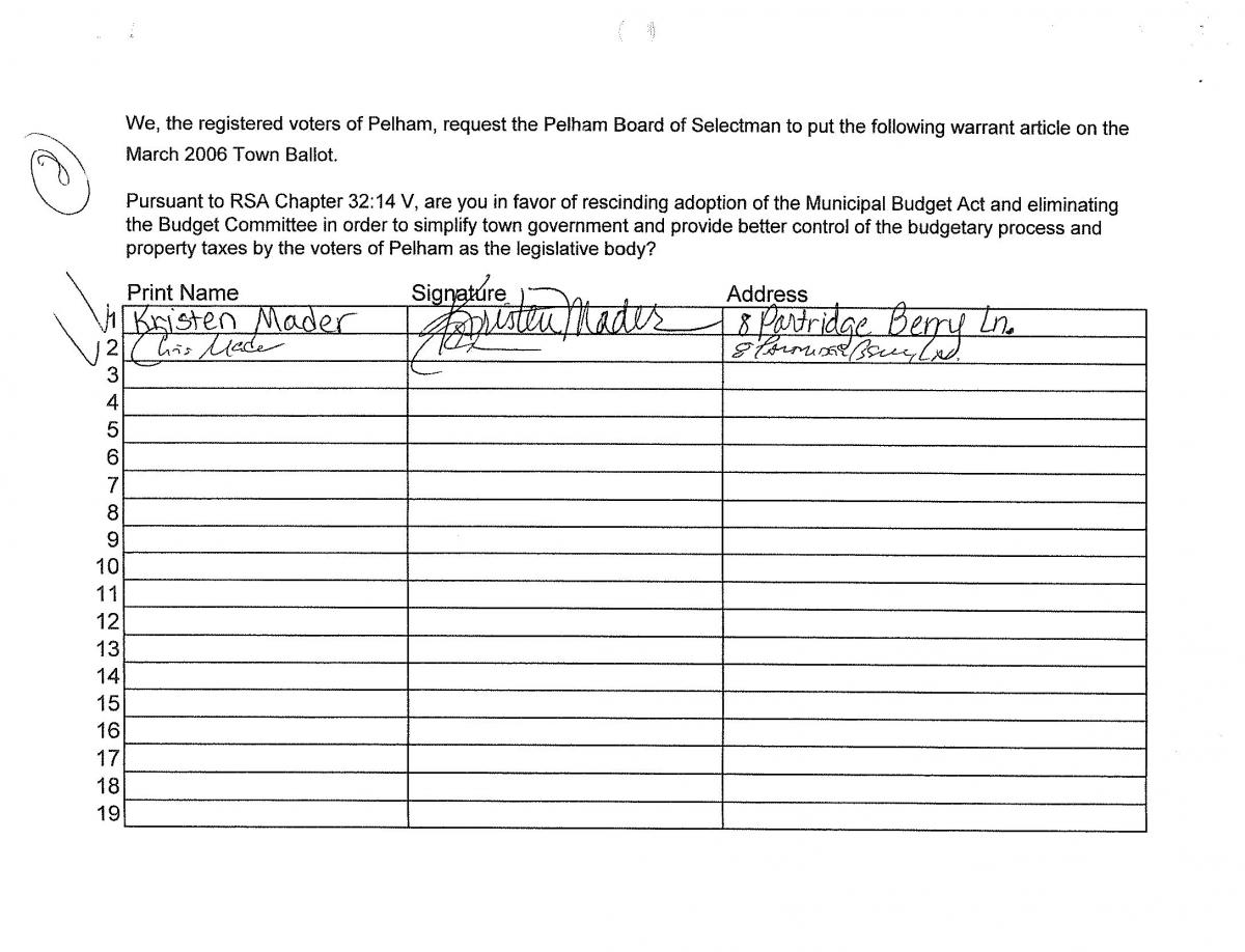 Pursuant to RSA Chapter 32:14 V, are you in favor of rescinding the adoption of the Municipal Budget Act and eliminating the Budget Committee? (Submitted by Petition)